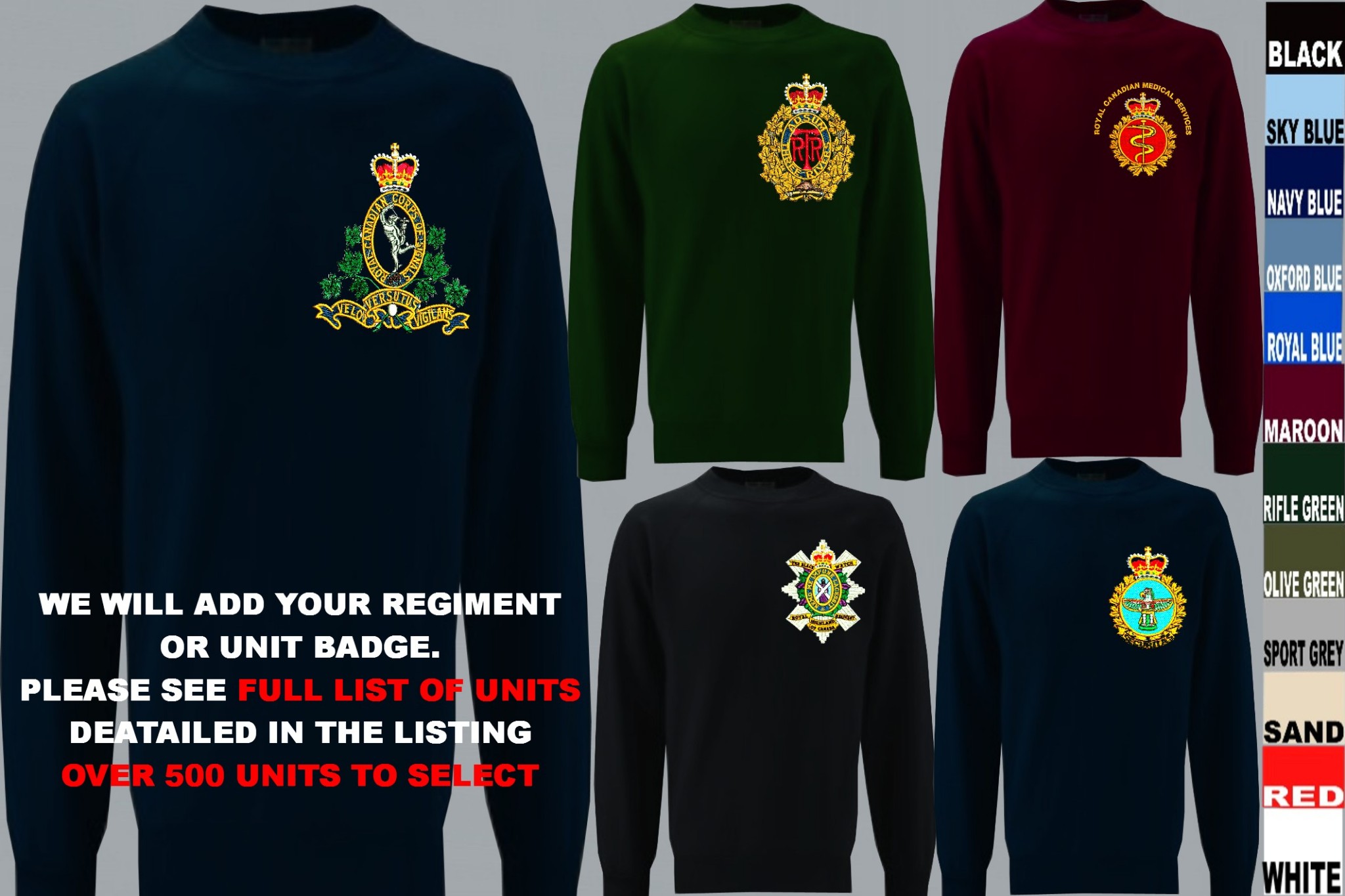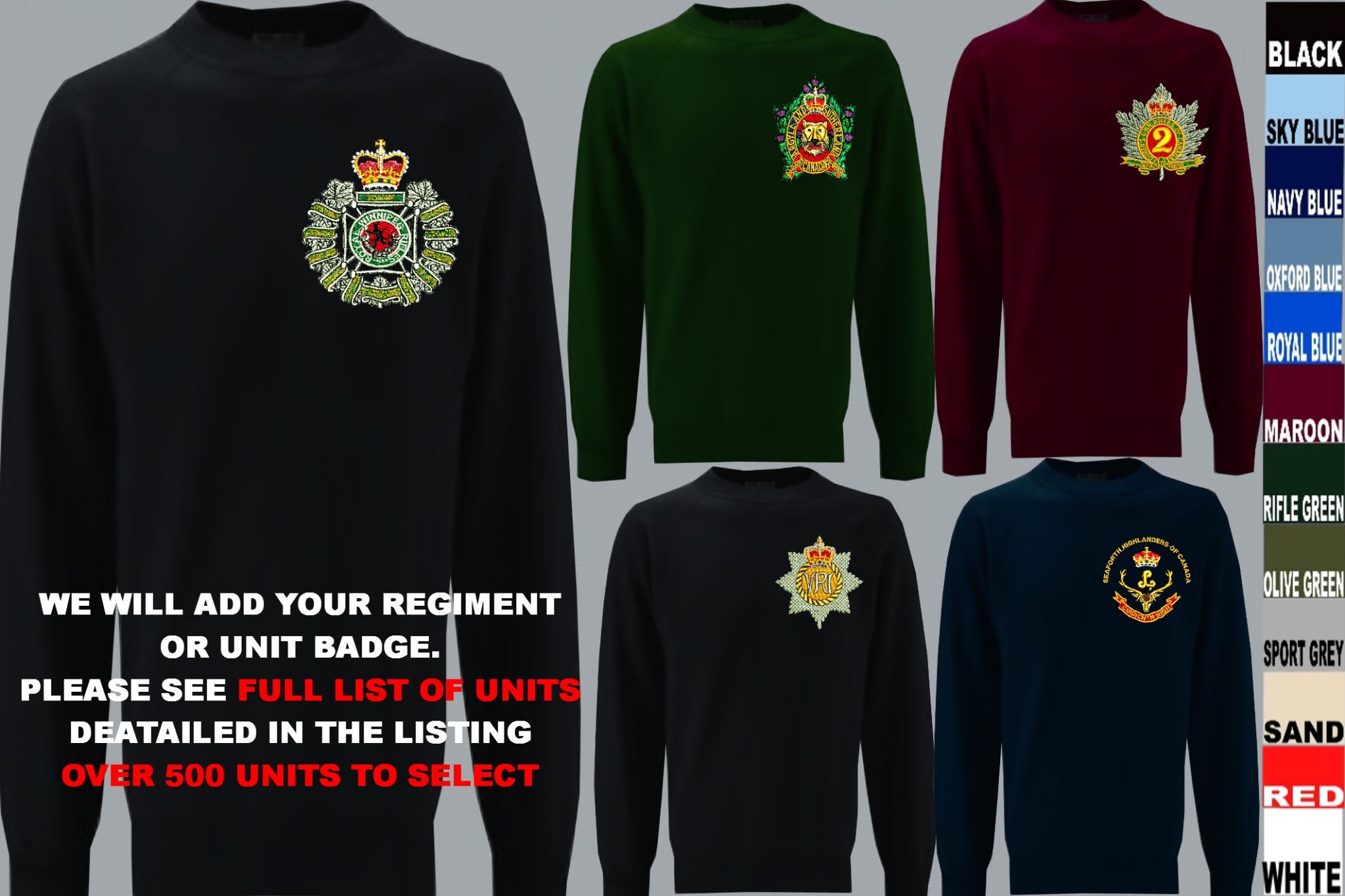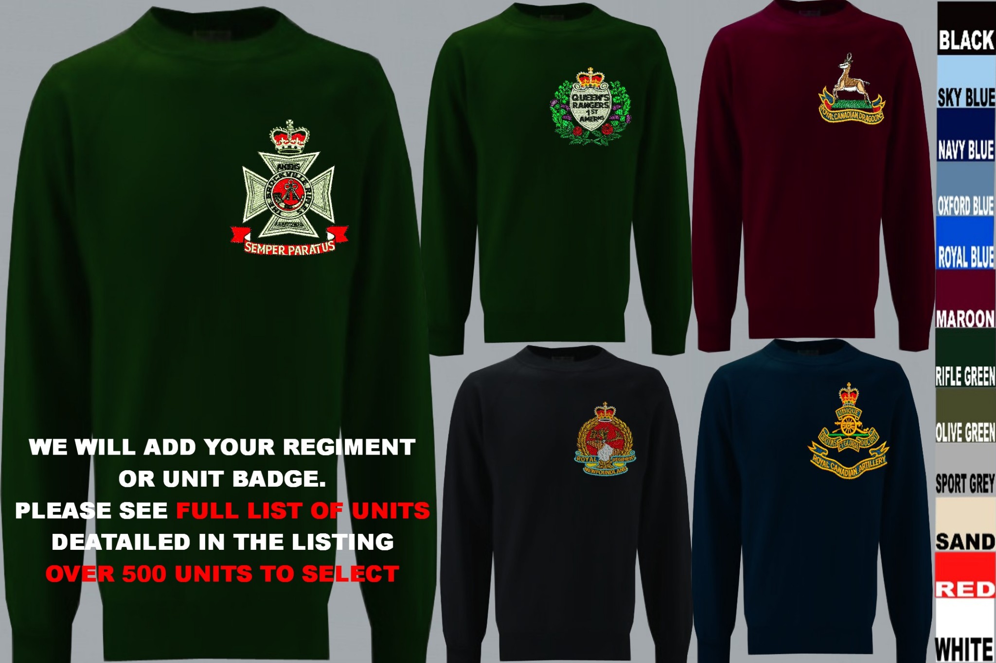 Ultra heavy weight 340gsm Deluxe Heavy Sweatshirts, 65% cotton / 35% polyester, available in a wide variety of Regiments Please use drop down boxes to select size, colour and regiment. Personalisation,Wings,TRF,DZs also available. Other Items/Colours also available please contact us for info.